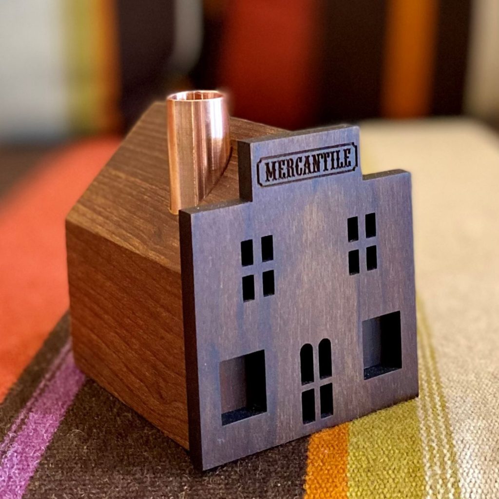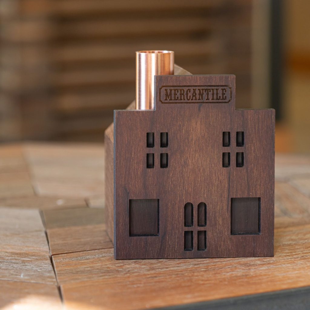 Festive and highly detailed, this Mercantile Shop wooden candlestick holder features a classic design with broad storefront windows, a curved front door, and a bold sign. Topped with a copper chimney, the candlestick holder transports you back to a time when these establishments served as the heart of frontier communities.