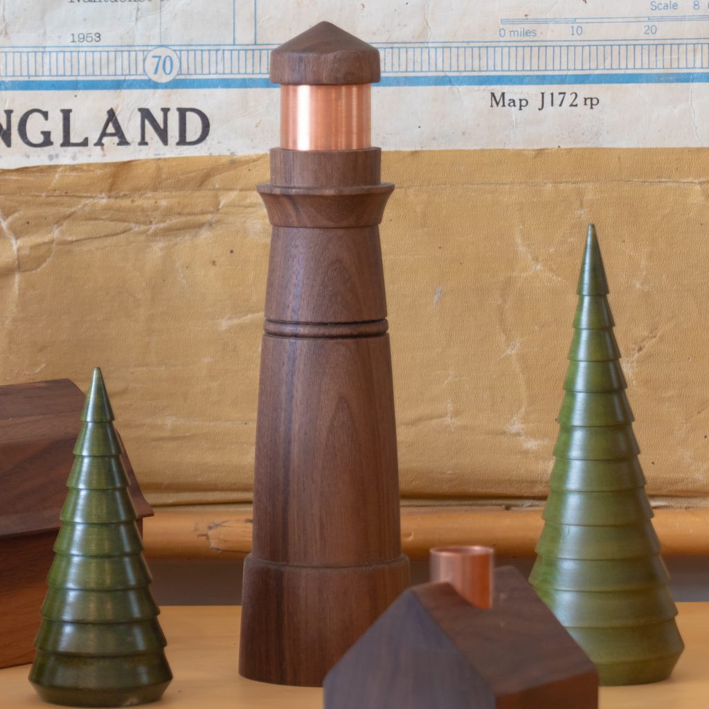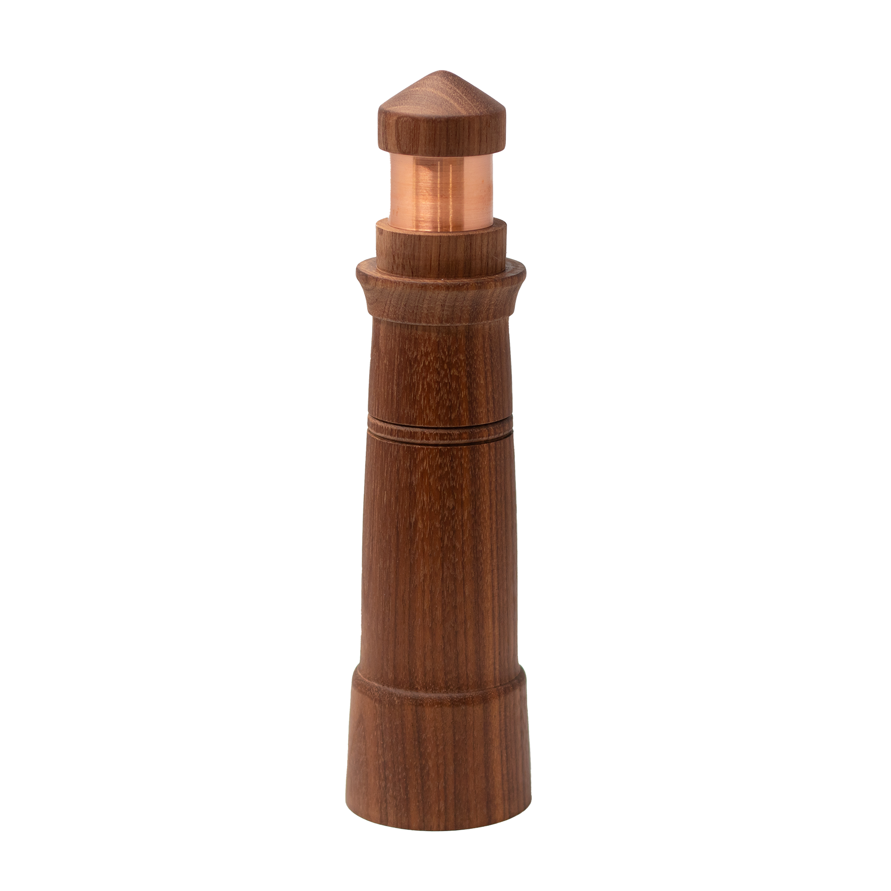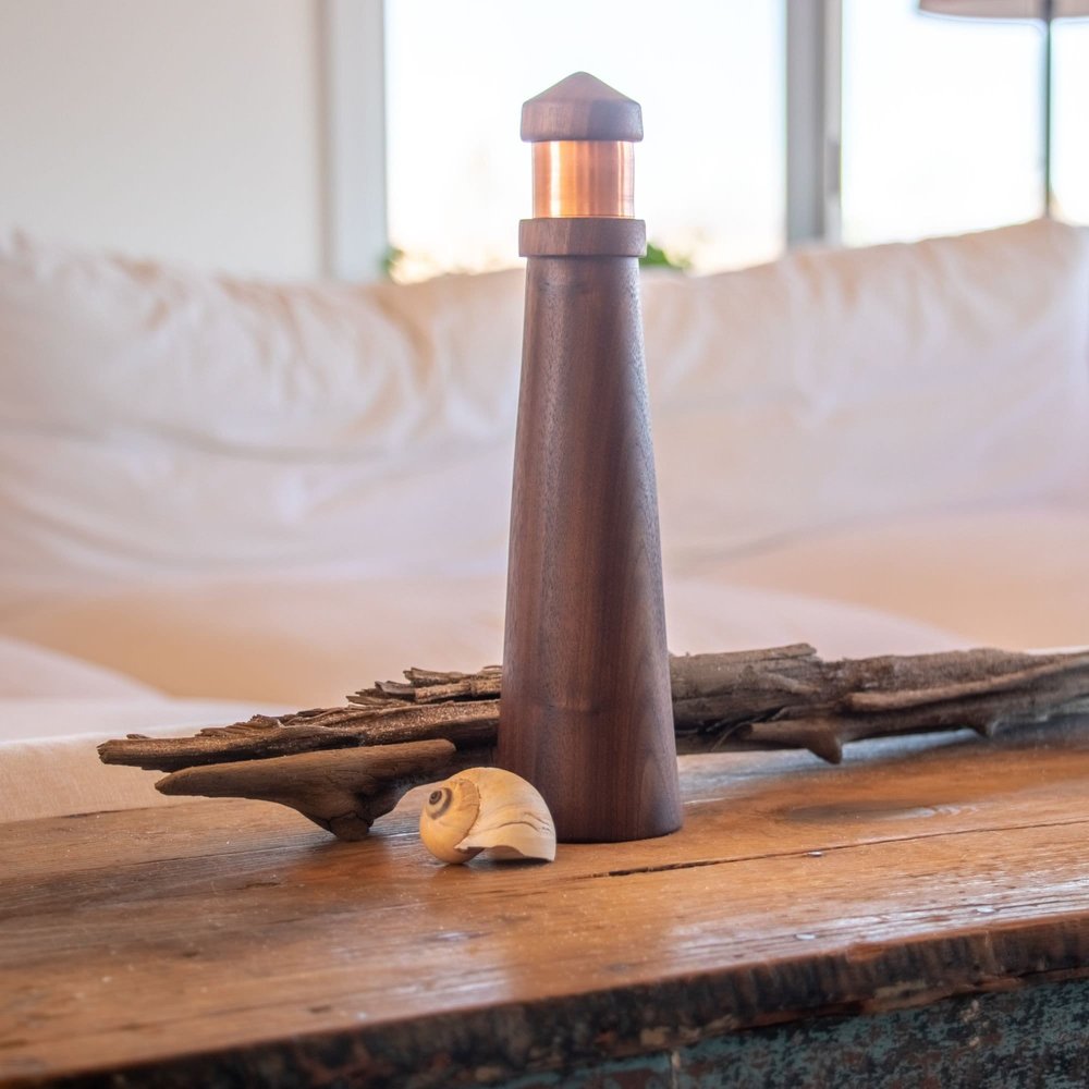 Hauskaa’s 2024 Limited Edition Wooden Lighthouse, meticulously created from premium walnut wood, embodies the essence of coastal charm and modern elegance. The wood lighthouse features a warm, copper lens that adds a touch of shine and sophistication to any space. A truly one-of-a-kind piece, the tiny lighthouse bears a unique hallmark engraved on the bottom. Hewn from only the finest furniture-grade walnut and 100% copper sourced domestically.