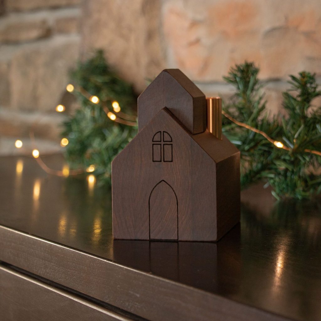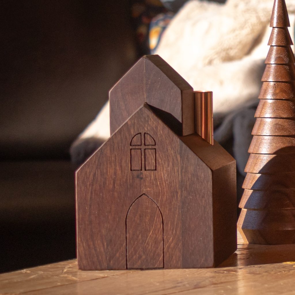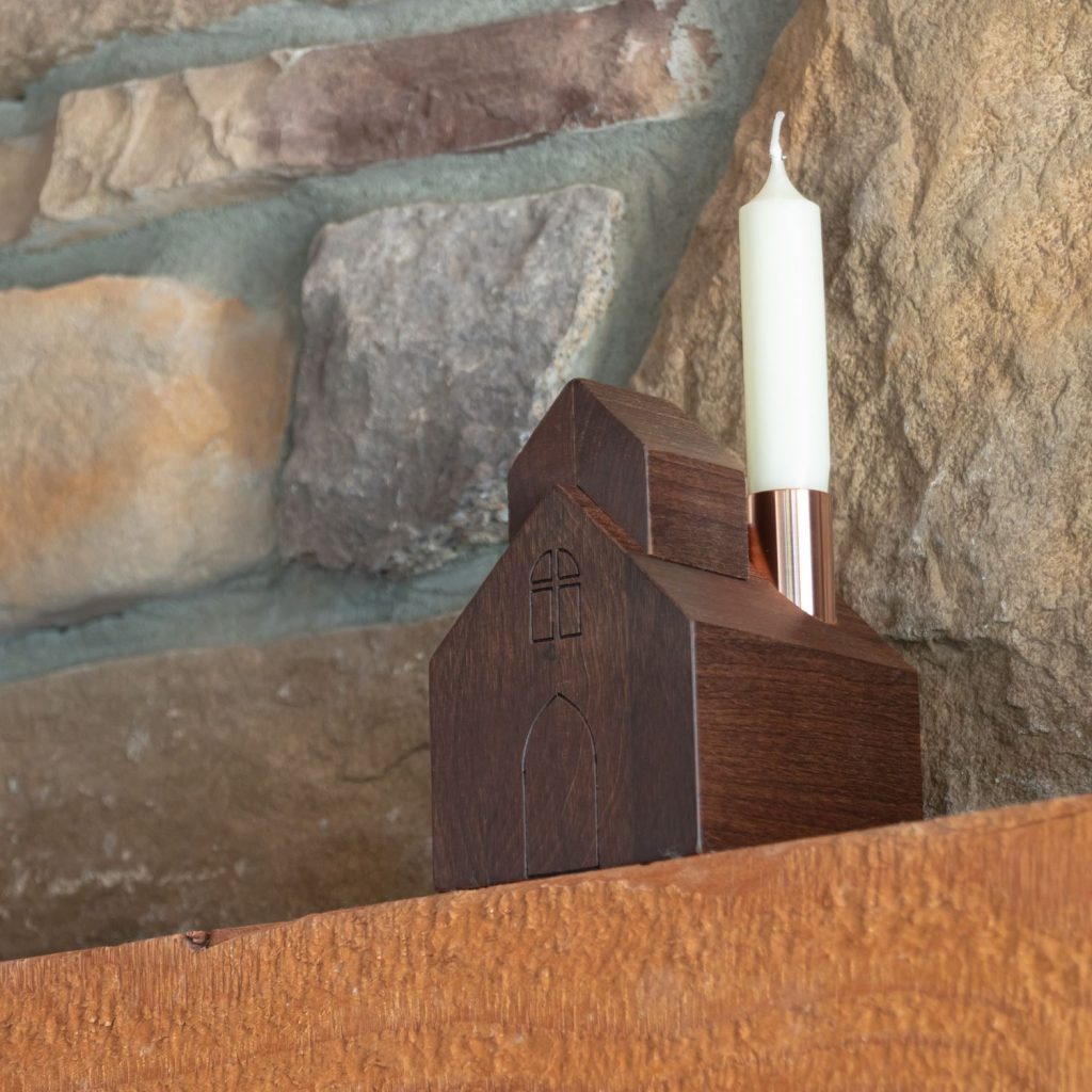 This decorative church is crafted from solid maple wood and features the classic design of an arched front door and paned window. The roof is complete with a simple belfry and copper chimney candlestick holder. Expert craftsmanship makes this wooden candlestick holder a work of art and serves as an homage to the unwavering spirit and resilience of frontier communities.