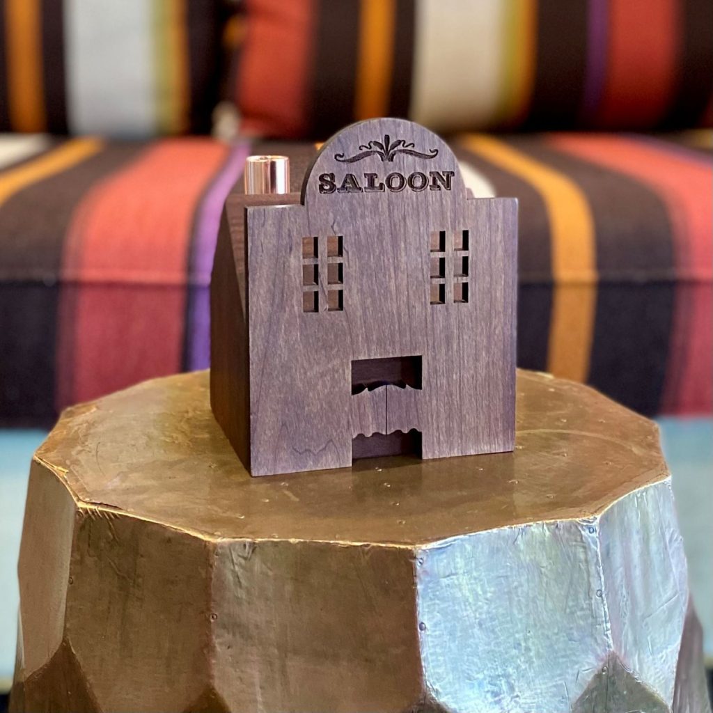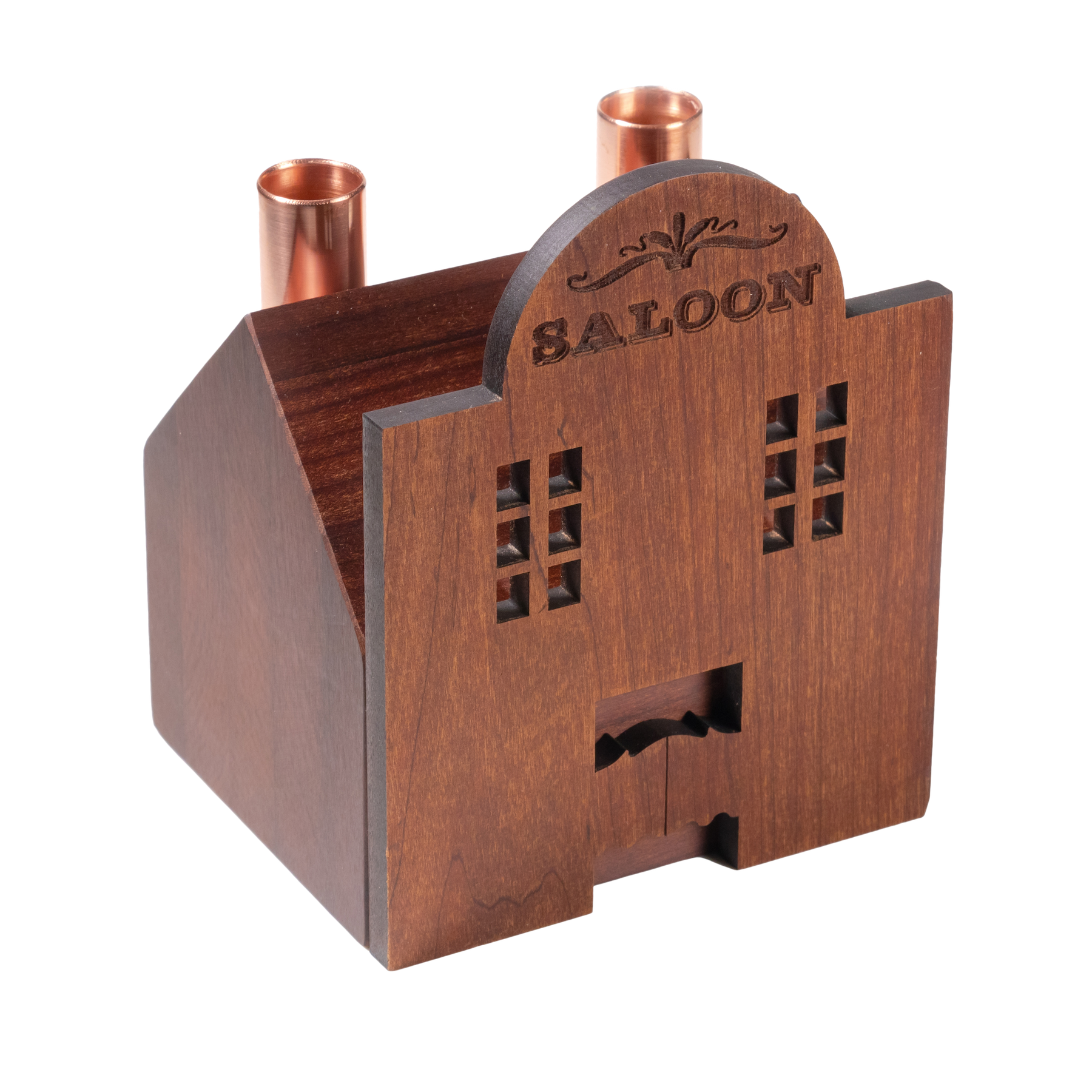 This classic saloon house is a stately two stories tall and features swing doors, open-paned windows, and a texted saloon sign with a decorative flourish. Two copper chimneys double as candlestick holders. Imagine the warm glow of candlelight flickering through the saloon’s windows, creating an inviting ambiance that transports you to the heart of the Wild West.