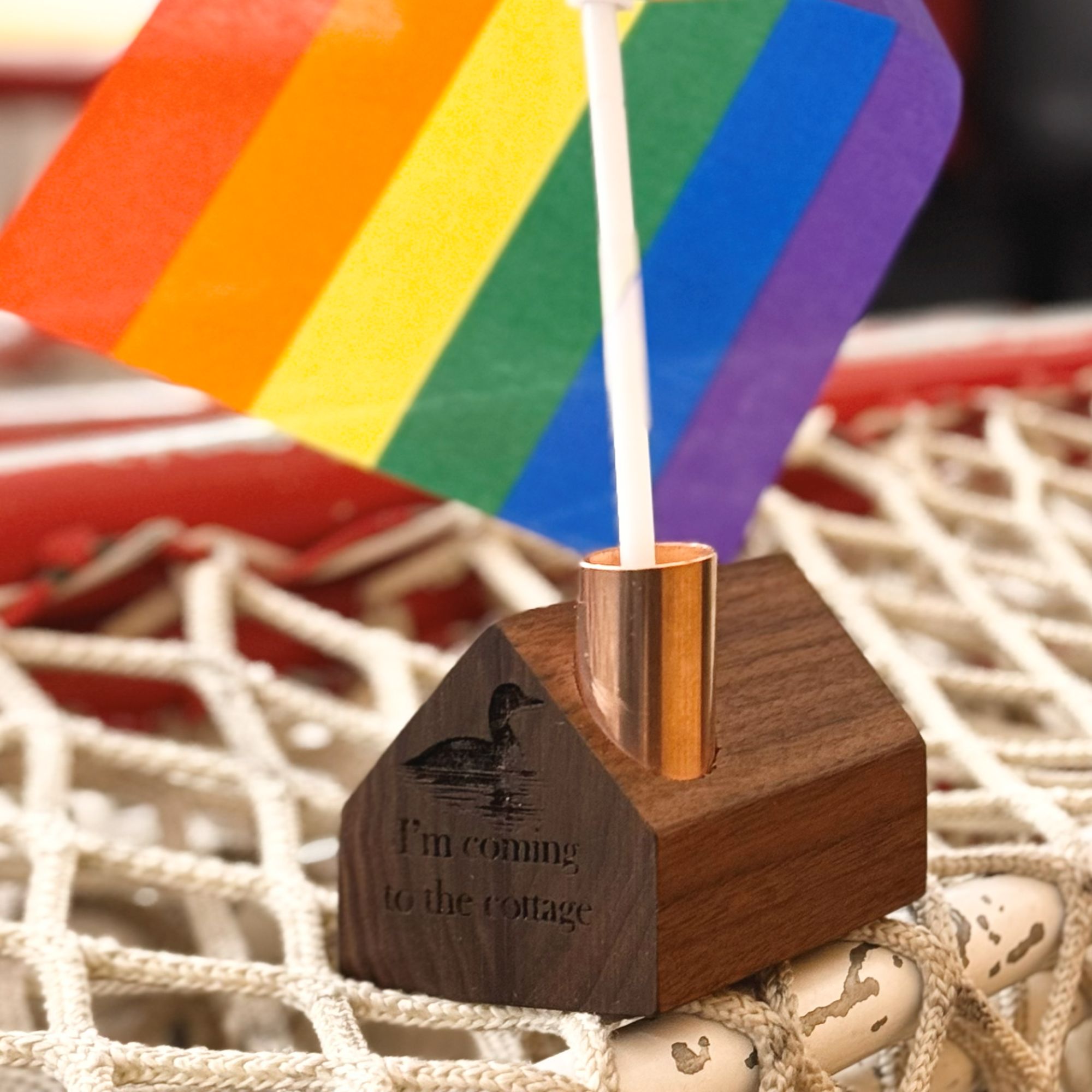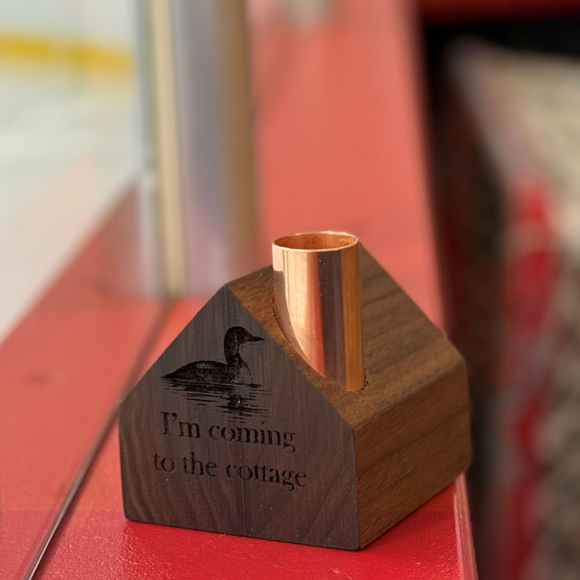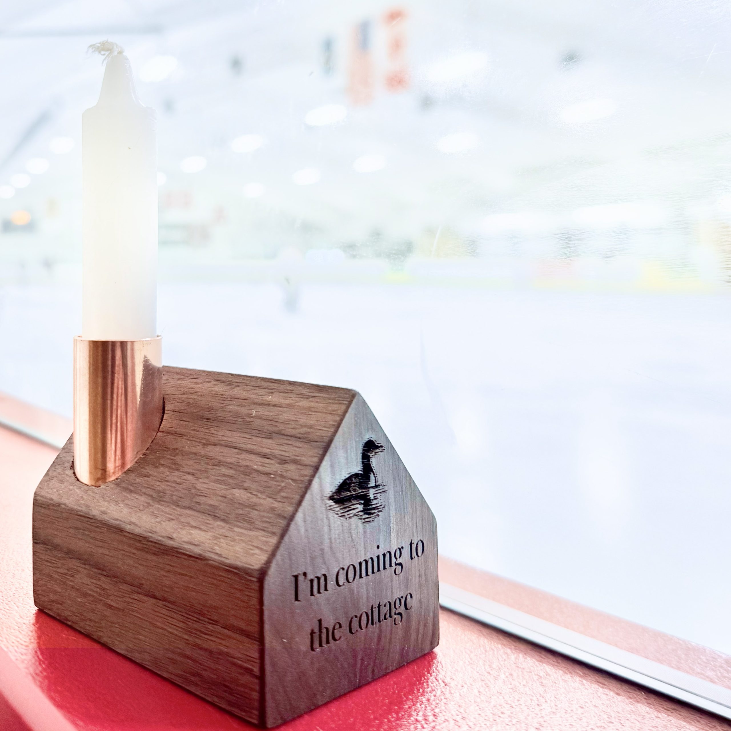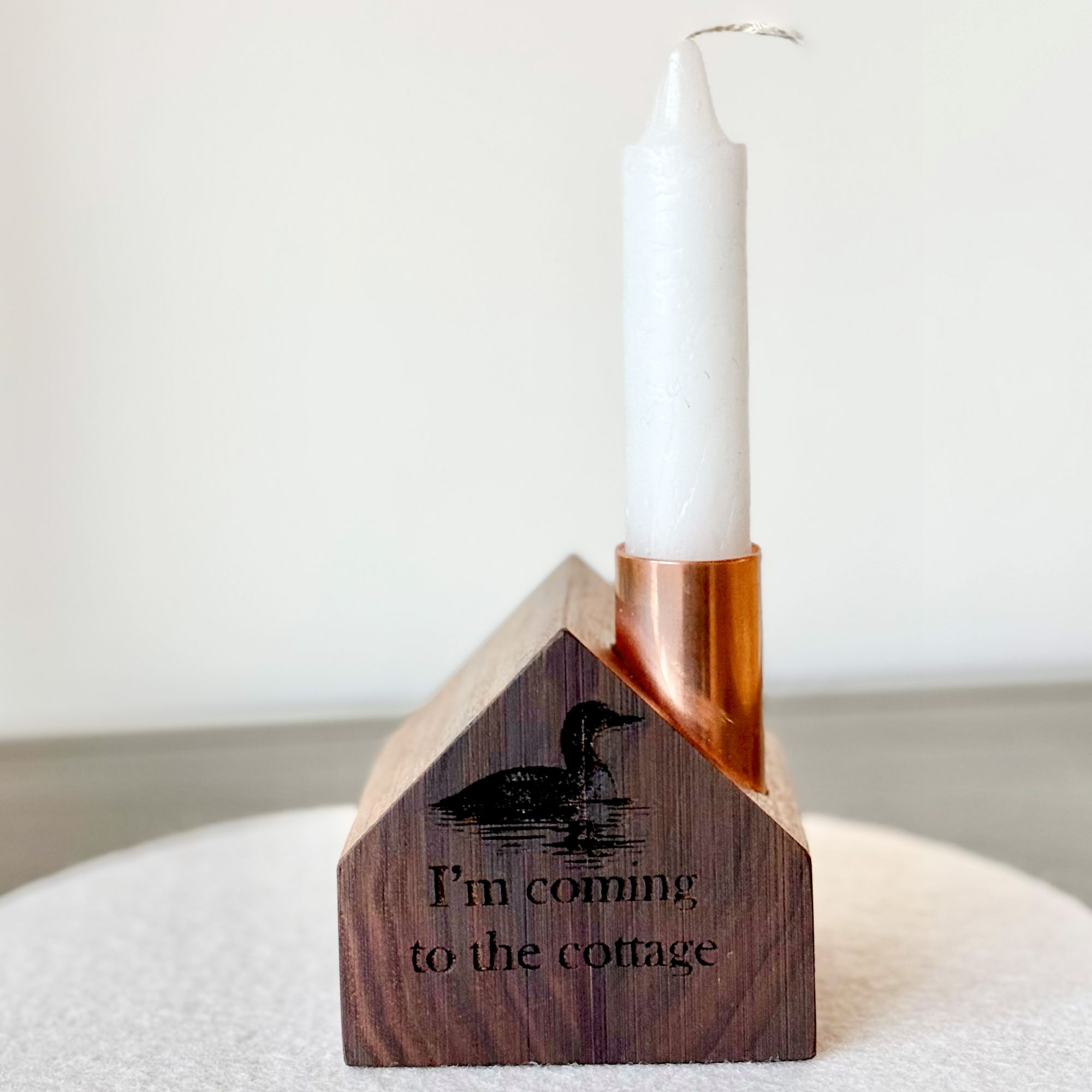 Each cottage is handcrafted in Vermont from upcycled wood and engraved with a graceful loon and the emotionally charged phrase. The copper chimney topper is designed to hold the included “Perfect Fit” taper candle, making it ready to light the scene.